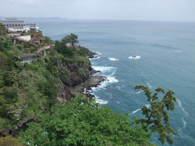 錦ヶ浦 熱海の景勝地錦ヶ浦は断崖絶壁の上から眺めると、海の景色が太陽 が登り出すと五色の光となって輝き出すことから、京の錦織に ちなんで錦ヶ浦と呼ばれるようになったそうです。 昔はあまりにも断崖絶であったために自殺するのに都合が良く 自殺の名所になったことがありました。大きな岩がゴロゴロあって イメージが悪いのでホテルの近くは岩をセメントで塗りつぶして テラス風にして良いイメージになるように改善されたそうです。
